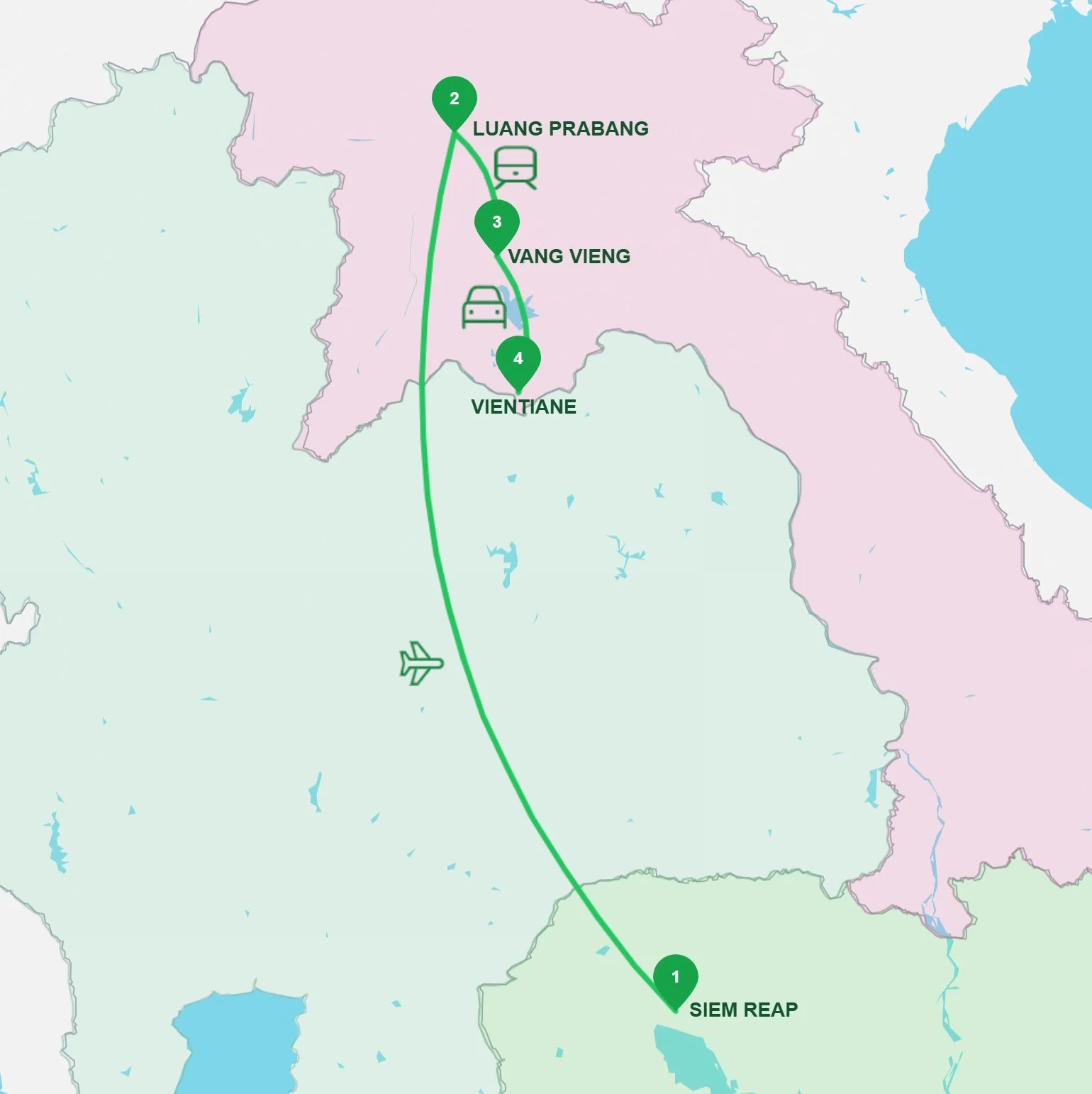 Vientiane, Vang Vieng, Luang Prabang, Siem Reap