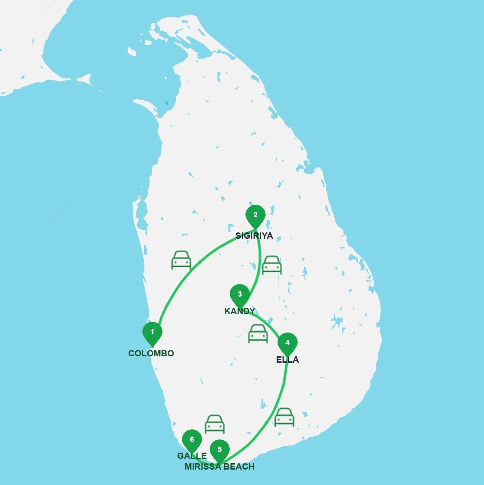 Colombo, Kandy, Sigiriya, Ella, Udawalawe, Mirissa, Galle